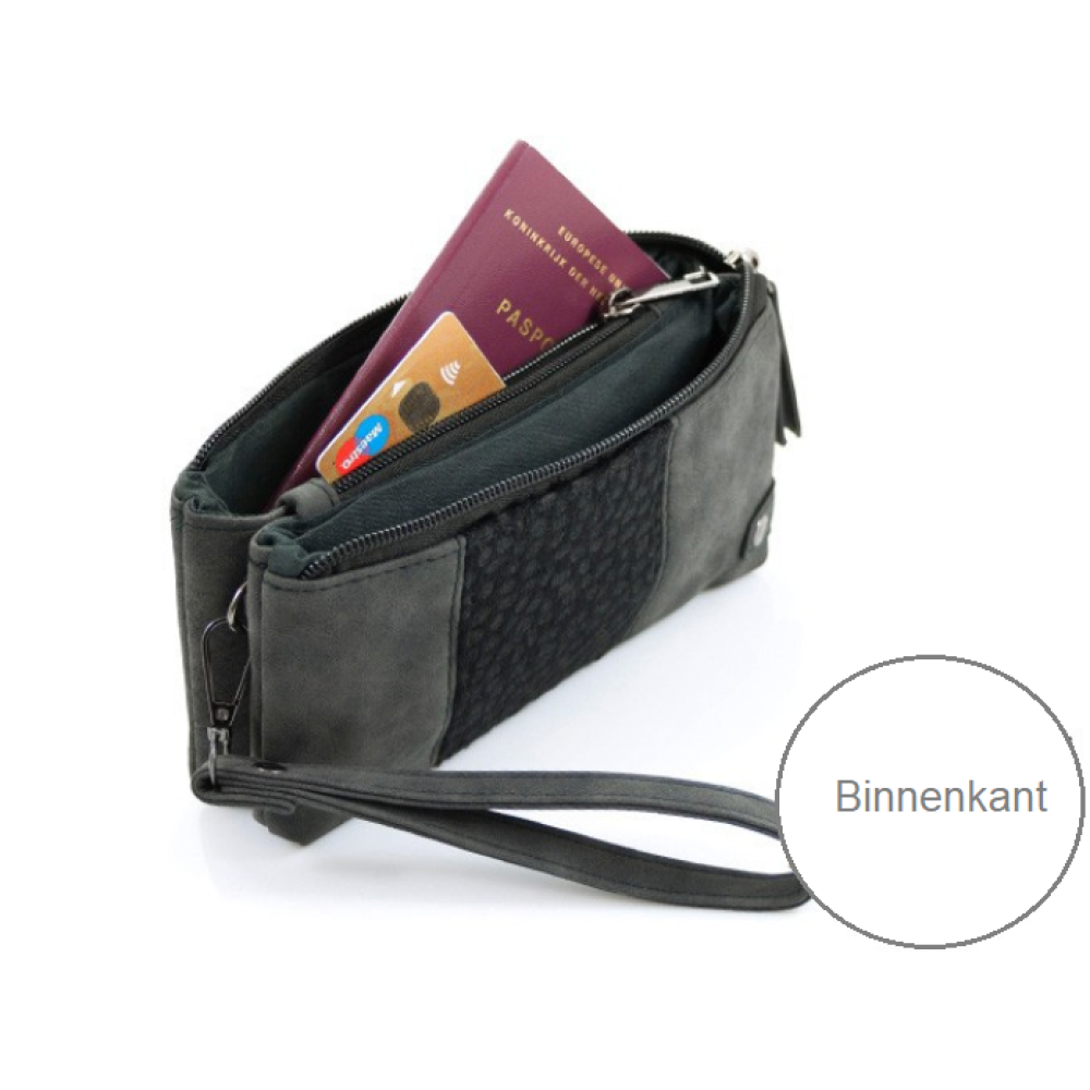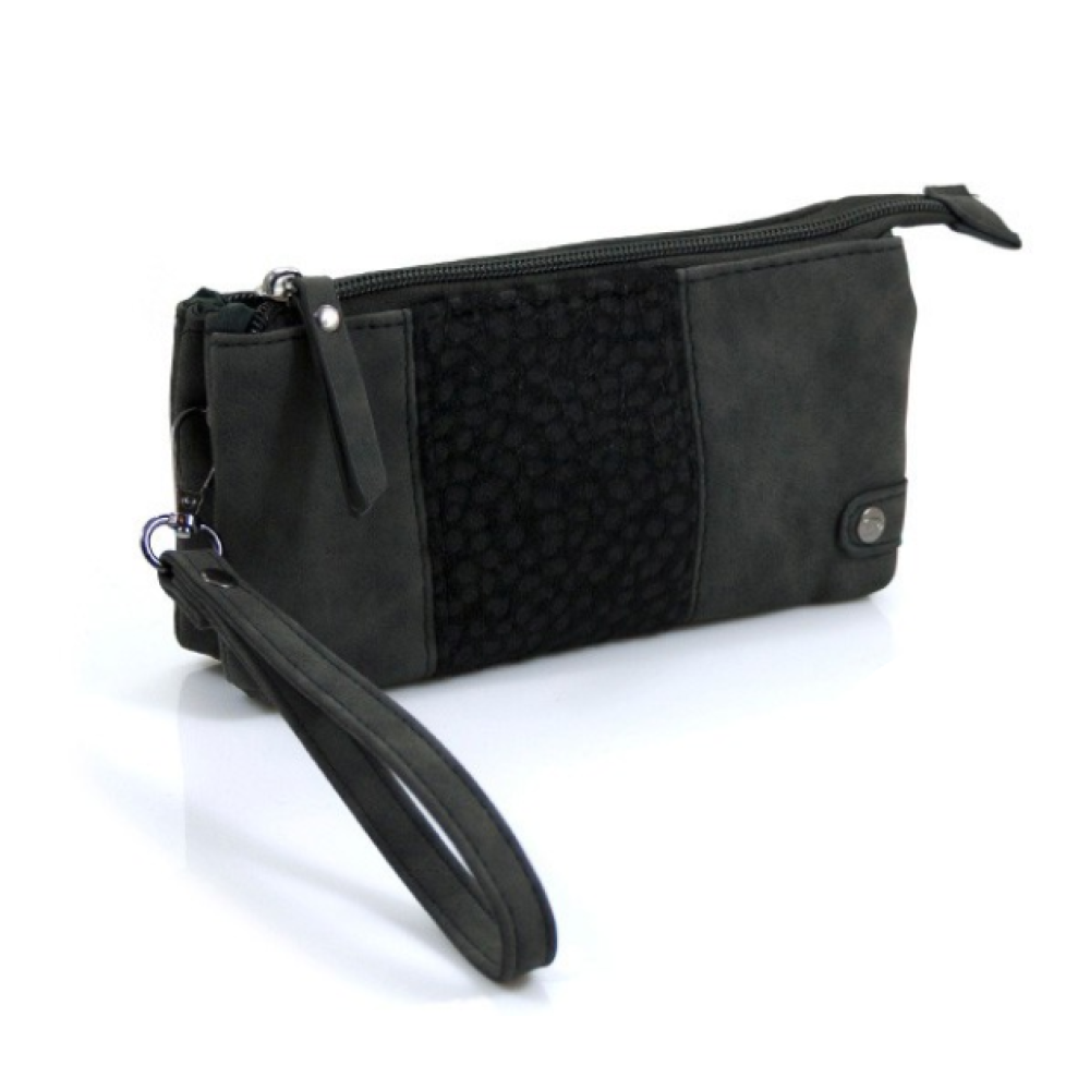 Grote portemonnee cq handtasje uitgevoerd in twee fraaie hoge kwaliteiten PU (kunstleer) materialen. Indeling : 2 grote vakken en het middenvak is er een vakje voor kleingeld voorzien van een ritsje.
